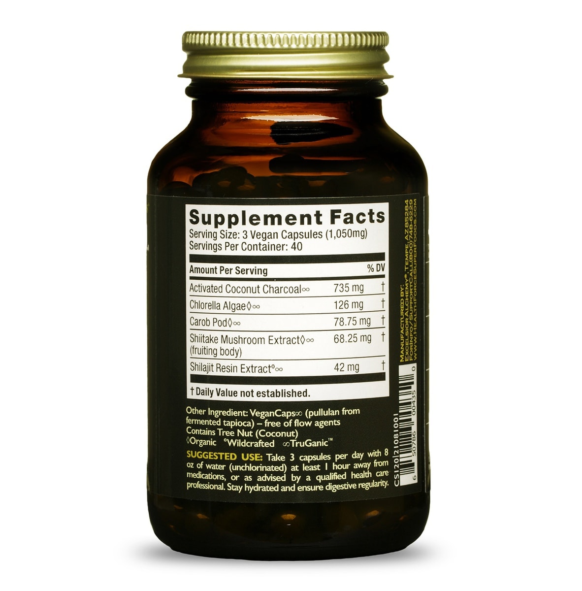 POWERFUL HERBS: The foundation of the formula is activated coconut charcoal (steam activated), a known adsorbent agent. This foundation is complemented by additional known binders and gastrointestinal (GI) tract supportive ingredients such as chlorella, carob, shiitake mushroom fruitbody extract, and shilajit extract, which complete the robustness and efficiency of Charcoal Supreme.*